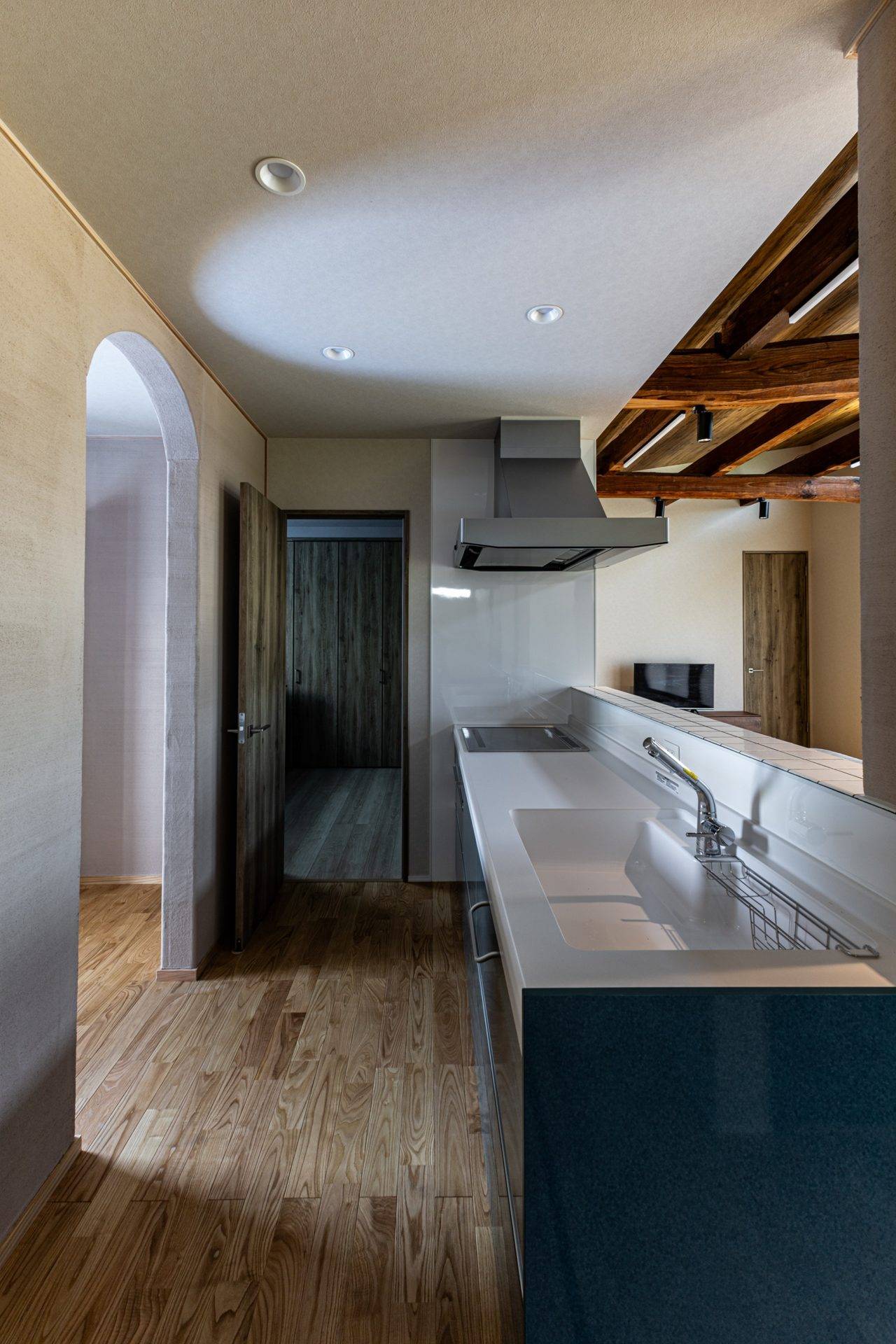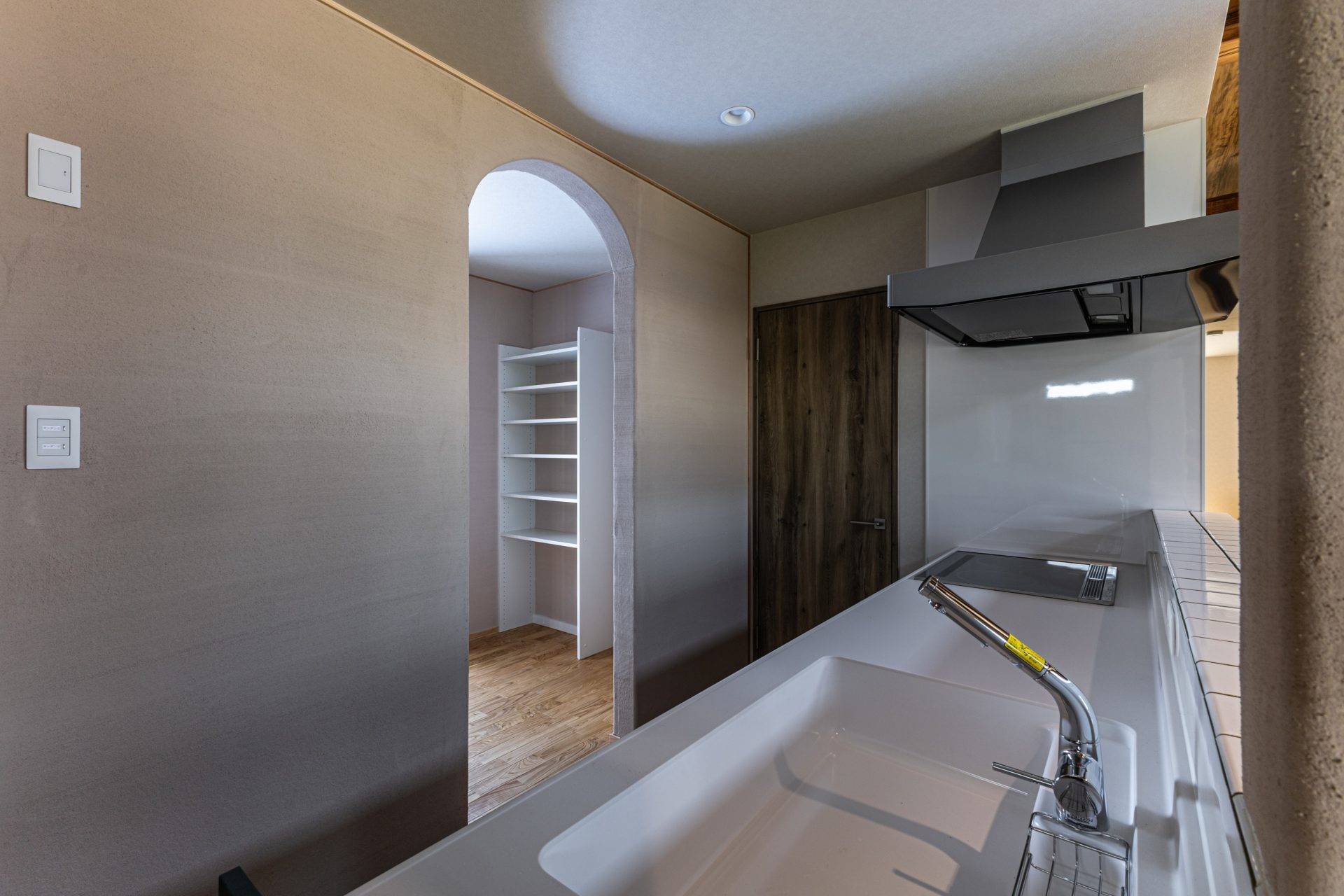 また、雑多になりがちなキッチンスペースをスッキリと見せるため、家電置場やパントリーはあえて壁で囲う計画に。太鼓梁と調和する自然素材の中霧島壁や、キッチンの腰壁にあしらったタイルが木目の多い空間の素敵なアクセントになりました。「キッチン足元の間接照明は、夜中の誘導灯になるね!」と、暮らしの中での発見も教えていただきました。