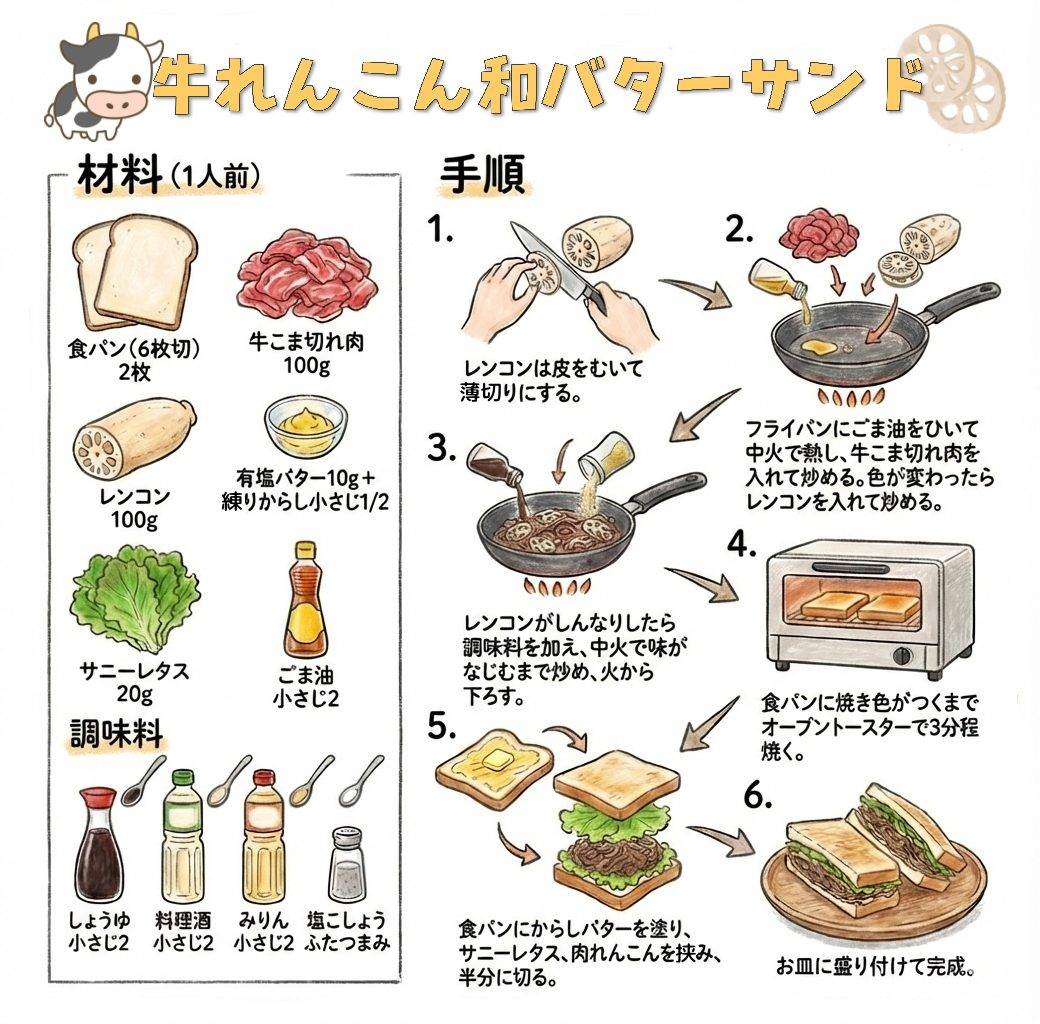 - 食パンにからしバターを塗り、サニーレタス、肉、れんこんを挟み、半分に切って完成。