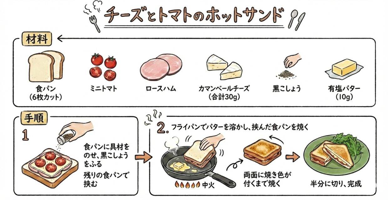 食パン、ミニトマト、ロースハム、カマンベールチーズ、それに有塩バターと黒こしょうだけで作れます。