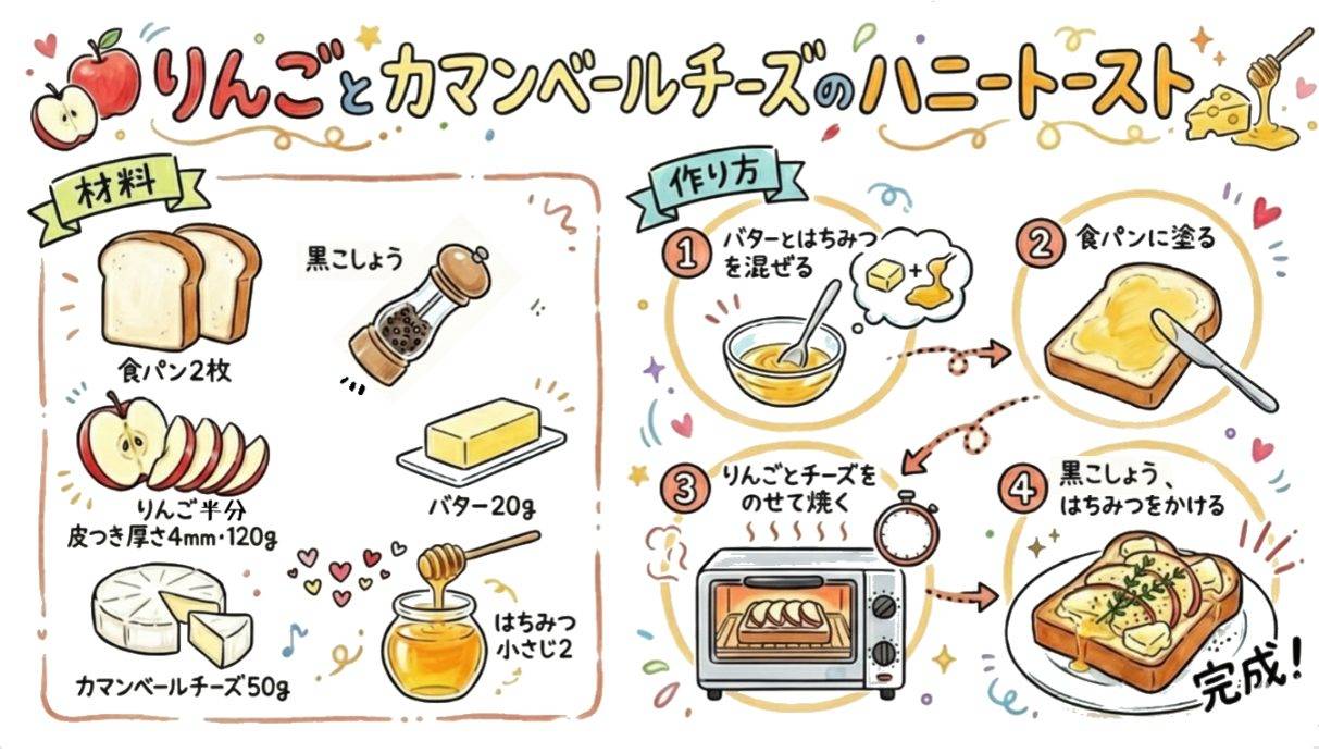 バターとはちみつを混ぜてパンに塗り、薄切りにしたりんごとカマンベールチーズをのせて、オーブントースターで焼くだけ。仕上げに黒こしょうとはちみつをかけたら完成です。